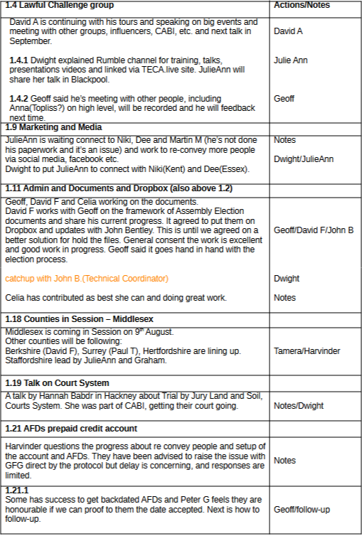 5. Lawful Challenge group David A is connecting with different groups over the next few weeks, such as Andrew Bridgen, Caroline Newman (Creditors Academy), and some former military. David will engage with the different groups, will contribute and update at the next meeting.