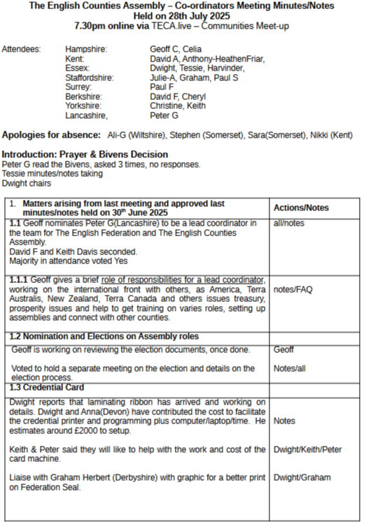 The English Counties Assembly – Co-ordinators Meeting Notes