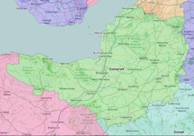 Somerset is a maritime county in the West Country of England. The county is mainly agricultural and is traditionally associated with cider production. The Somerset coast includes the resort towns of Minehead, Watchet, Burnham-on-Sea, Weston-super-Mare and Clevedon. In the north of the county, on the River Avon, lies the jewel that is Bath, built by the Romans on the hot springs though equally famous for its Georgian splendour. Downstream is the mediƦval market town of Keynsham and then Bristol, the southern part of which, including Bedminster, Knowle and Whitchurch, lies in Somerset. South of Bristol run the Mendip Hills, including the spectacular Cheddar Gorge. In the heart of the county are the Somerset Levels, an ancient flat landscape drained by "rhines" and above which rises Glastonbury Tor. East of the levels lies the cathedral city of Wells. South of the levels, Bridgwater is famous for its Guy Fawkes illuminated carnival. The south of Somerset is a quiet rural area with a few small towns including Somerton, Wincanton, Yeovil and Chard. Taunton in the south-west has over 1,000 years of religious and military history. To its west lies Exmoor, a high sandstone moor and a national park.